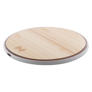 Wireless charger (15W) in bamboo and plastic housing. Including USB charger cable.