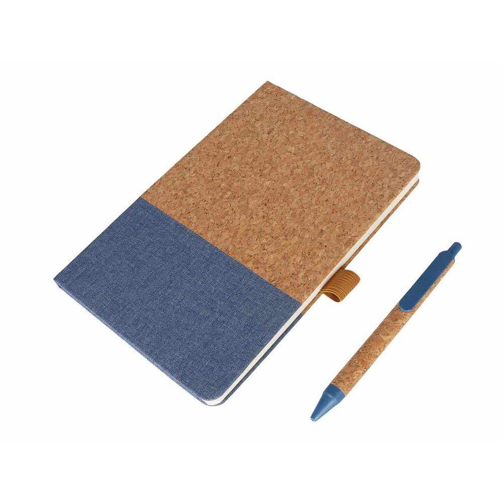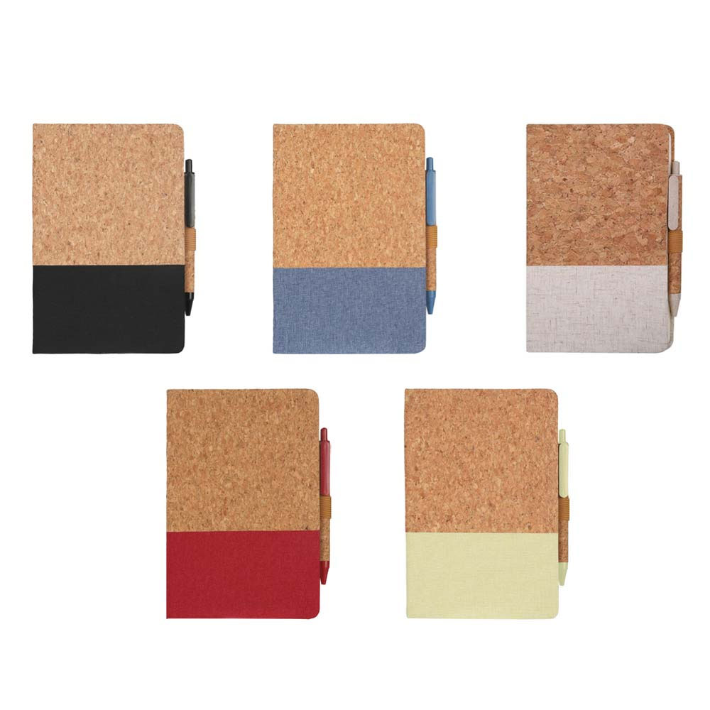 eco friendly notebook made from a combination of linen and cork materials. Also includes a matching eco friendly pen made from Cork and Eco-Friendly Wheat Straw. Packed in a Eco-Friendly Gift Box.