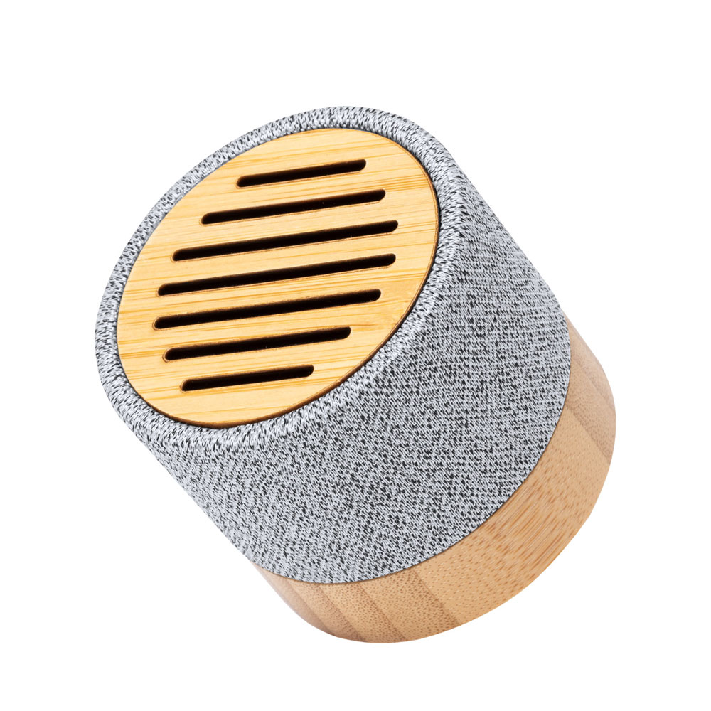 Bluetooth speaker in RPET polyester fabric covered bamboo housing, with built-in rechargeable battery. Including USB charge