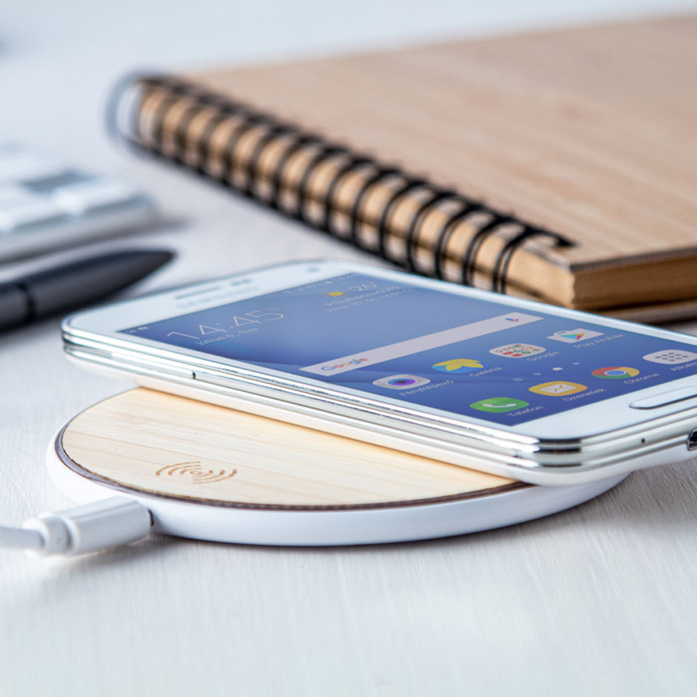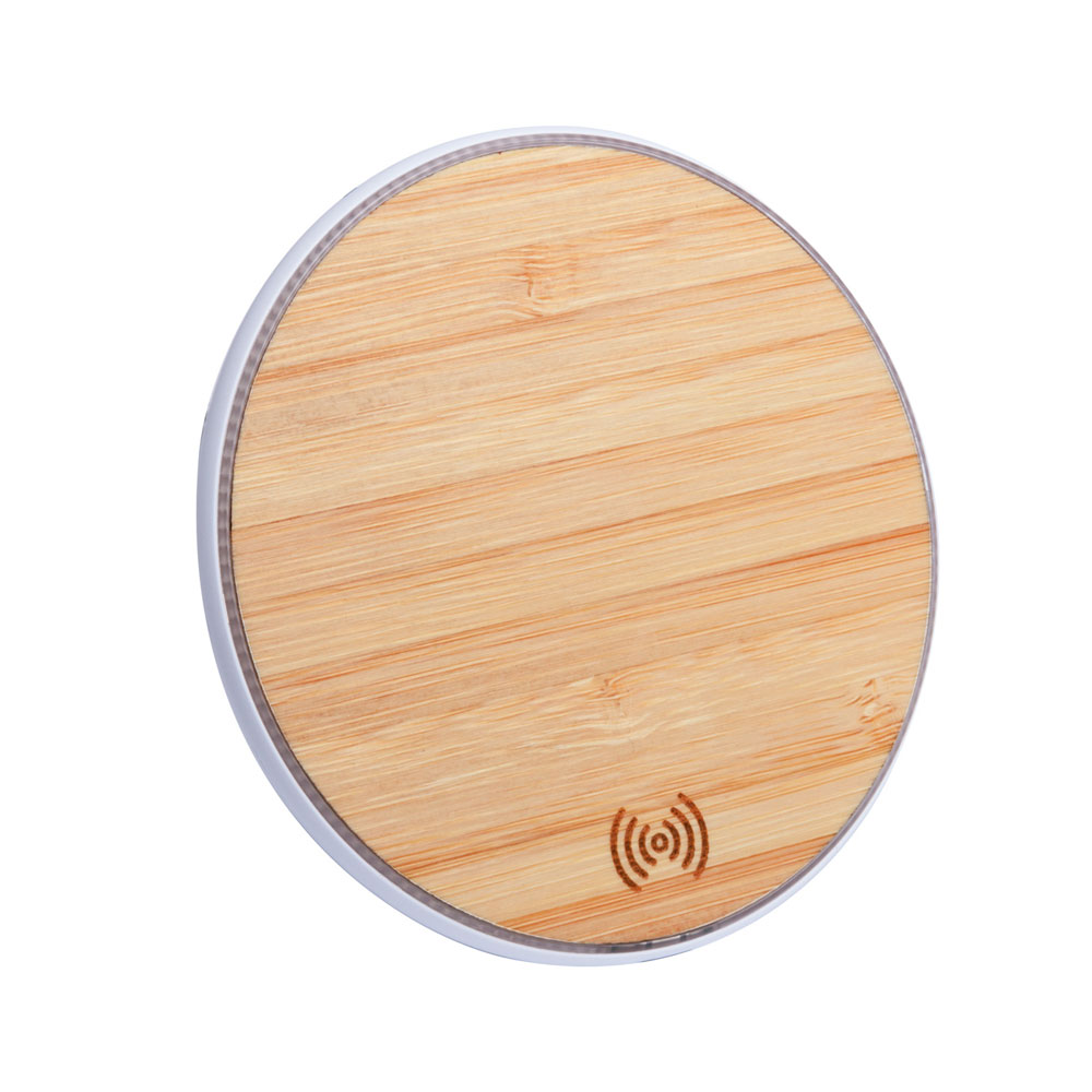 Wireless charger (15W) in bamboo and plastic housing. Including USB charger cable.